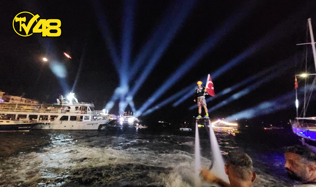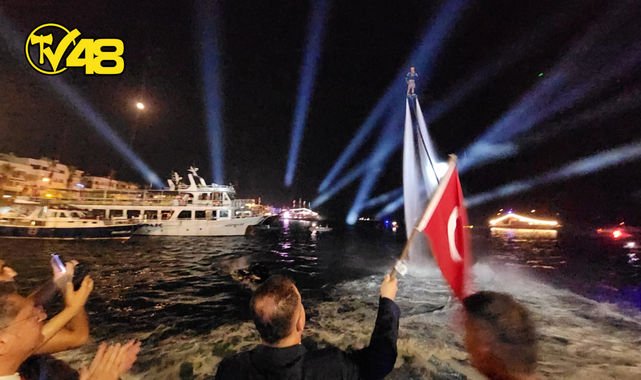 Türk bayraklarıyla donatılan ve ışıklandırılan Sahil Güvenlik gemisi ve botu da Marmaris açıklarında demirledi.