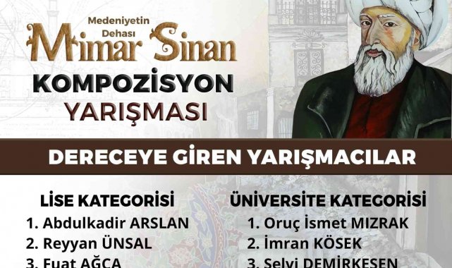 Büyükşehir Belediyesi'nin kültür sanat etkinlikleri çerçevesinde düzenlediği, Kayseri'nin bağrından çıkıp, tüm dünyaya örnek olan Mimar Sinan'ı anlatacak "Medeniyetin Dehası Mimar Sinan" adlı kompozisyon yarışmasının kazananları belli oldu. 218 gencin katıldığı yarışmada lise ve üniversite kategorisinde jürinin değerlendirmesi sonucu dereceye girenler belirlendi.
