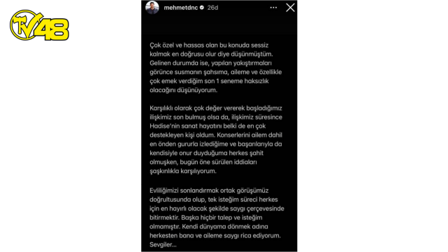 Evliliğimizi sonlandırmak ortak görüşümüz doğrultusunda olup tek isteğim süreci herkes için en hayırlı olacak şekilde saygı çerçevesinde bitirmektir. Başka hiç bir talep ve isteğim olmamıştır. Kendi dünyama dönmek adına herkesten bana ve aileme saygı rica ediyorum. Sevgiler..."