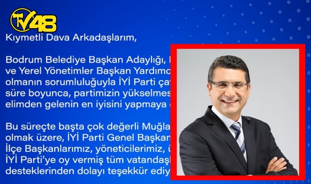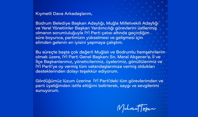 "Kıymetli Dava Arkadaşlarım, Bodrum Belediye Başkan Adaylığı, Muğla Milletvekili Adaylığı ve Yerel Yönetimler Başkan Yardımcılığı görevlerini üstlenmiş olmanın sorumluluğuyla İYİ Parti çatısı altında geçirdiğim süre boyunca, partimizin yükselmesi ve gelişmesi için elimden gelenin en iyisini yapmaya çalıştım. Bu süreçte başta çok değerli Muğlalı ve Bodrumlu hemşehrilerim olmak üzere, İYİ Parti Genel Başkanı Sn. Meral Akşener’e, İl ve İlçe Başkanlarımız, yöneticilerimiz, üyelerimiz, gönüllülerimiz ve İYİ Parti’ye oy vermiş tüm vatandaşlarımıza vermiş oldukları desteklerinden dolayı teşekkür ediyorum. Gördüğümüz lüzum üzerine İYİ Parti’deki tüm görevlerimden ve parti üyeliğimden istifa ettiğimi belirterek, saygı ve sevgilerimi sunuyorum. Mehmet TOSUN"