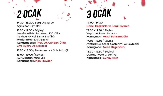 Büyükşehir Belediyesinden yapılan açıklamaya göre, Kurtuluş Haftası Kutlamaları etkinliği 2-9 Ocak tarihleri arasında gerçekleşecek. Etkinlik, 2 Ocak'ta 'Milli Mücadele', 'Yüzyıl' ve 'Mersin'in Hafızası' sergilerinin açılışı ile başlayacak. 8 gün sürecek etkinlik boyunca edebiyatçı, tarihçi, akademisyen ve yazarlar tarafından söyleşiler gerçekleştirilecek. Ayrıca performanslar ve çeşitli deneyim alanları da Yenişehir Etkinlik Alanında Mersinlilerle buluşacak.