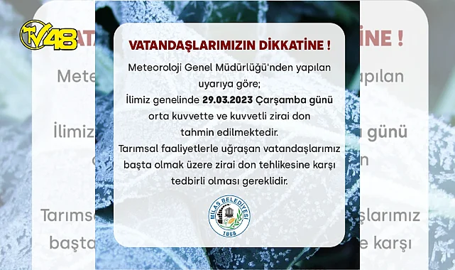 İlimiz genelinde 29.03.2023 Çarşamba günü orta kuvvette ve kuvvetli zirai don tahmin edilmektedir.