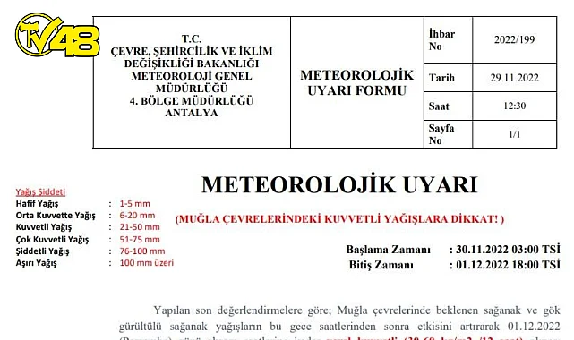 Yapılan son değerlendirmelere göre, Muğla çevrelerinde beklenen sağanak ve gök gürültülü sağanak yağışların 29 Kasım tarihi gece saatlerinden itibaren şiddetini arttıracağına vurgu yapılan açıklamada, 1 Aralık Perşembe günü akşam saatlerine kadar yerel kuvvetli, (30-60 kg/m2/12saat) olması beklendiğinden sel, su baskını, yıldırım, heyelan ve kuvvetli rüzgar gibi olumsuzluklara karşı dikkatli olunması istendi.