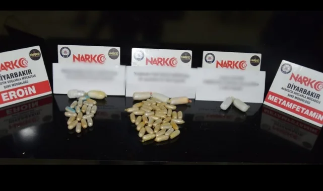 Diyarbakır Narkotik Suçlarla Mücadele Şube Müdürlüğü ekiplerinin otogarda yaptıkları çalışmalarda şüphe üzerine hastaneye götürülerek tomografi çektirilen 3 İran uyruklu şahsın mide ve bağırsaklarında 7 kapsül halinde 265,24 gram metamfetamin maddesi, 57 kapsül halinde 523,9 gram eroin maddesi ele geçirildi.