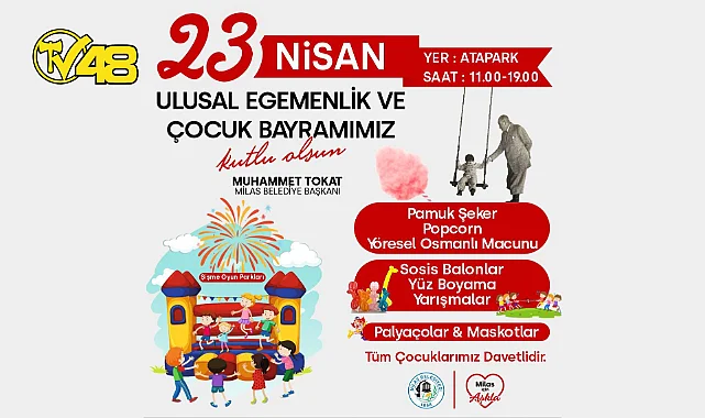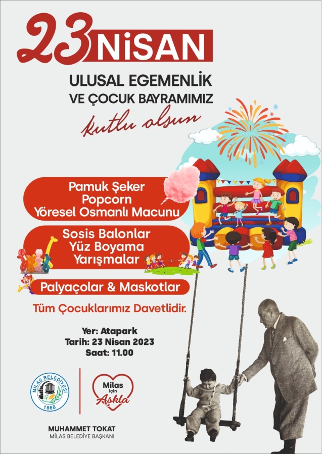 Milas halkını cumhuriyetin ikinci yüzyılında gerçekleşecek 23 Nisan Ulusal Egemenlik ve Çocuk Bayramı etkinliklerine davet eden Milas Belediye Başkanı Muhammet Tokat, “Çocukları çok seviyoruz ve çocuklarımızın yüzünün gülmesi, bayram coşkusunu doyasıya yaşaması için çalışıyoruz. Biliyoruz ki, çocuklarımıza armağan edilen ve tek evrensel bayram olma özelliğini taşıyan 23 Nisan, çocuklarımızın kötülükten uzak yürekleri, gözlerindeki ışıltı ve çalışkanlıklarıyla yarınlarımıza umut olacaktır.” dedi.