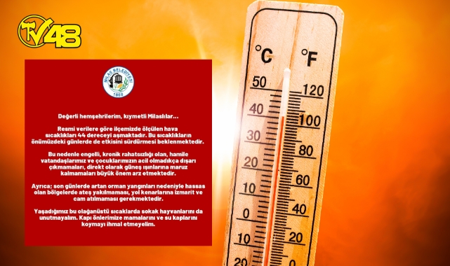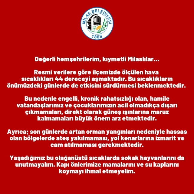 Aşırı sıcaklara ilişkin uyarıda bulunan Milas Belediye Başkanı Muhammet Tokat sosyal medya hesabından paylaşım yaptı.