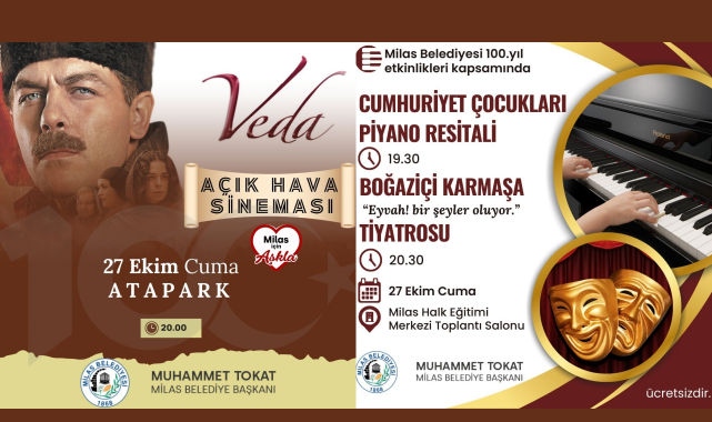Cumhuriyet coşkusunu birbirinden farklı etkinliklerle vatandaşlara yansıtmaya hazırlanan Milas Belediyesi, 27 Ekim Cuma günü akşam saat 20.00’de Atapark’ta kuracağı büyük ekranda VEDA filmini yayınlayacak.
