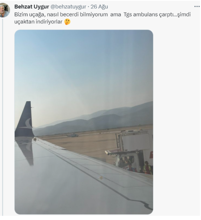 Milas- Bodrum Havalimanı’ndan saat 17.40 civarlarında İstanbul’a hareket edecek Anadolujet uçağına ambulift çarptı. Kaza esnasında uçakta bulunan tiyatro sanatçısı Behzat Uygur çektiği fotoğraf ile sosyal medya hesabından kazayı duyurdu. Behzat Uygur Tweeter’den yaptığı paylaşımda, “Bizim uçağa, nasıl becerdi bilmiyorum ama TGS ambulans çarptı şimdi uçaktan indiriyorlar” ifadelerini kullandı.