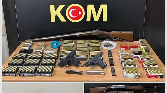 Edinilen bilgilere göre, operasyon kapsamında şüphelilerin adreslerinde yapılan aramalarda 6 ruhsatsız tabanca, 2 av tüfeği, 1 kurusıkı tabanca, 15’ten fazla tabanca şarjörü, 2 bin 200’ün üzerinde fişek, bıçak, muşta, teleskopik jop, 2 adet biber gazı ve bir miktar esrar bulundu.
