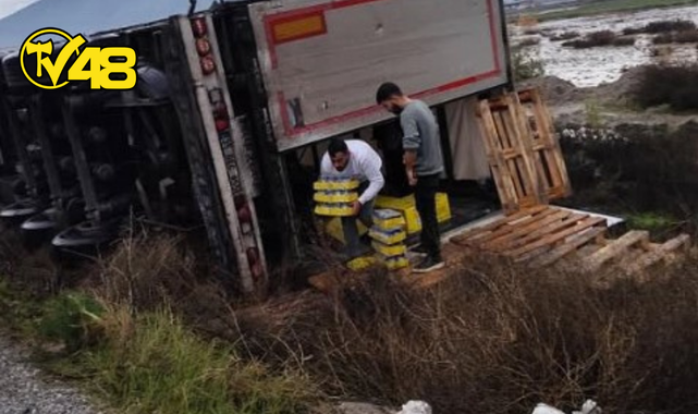 Muğla’nın Milas ilçesi Savran Mahallesi yolunun girişinde konserve yüklü bir tırın devrilmesi sonucu trafik kısa süreliğine kontrollü olarak sağlandı.