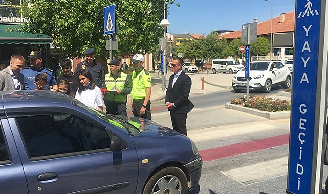 Kaymakam Böke sürücülere uyarılarda bulunup kısa süreli sohbet ederken, öğrenciler ise araçta bulunan çocuklara düdük hediye ederek, içerisinde bulundukları araçların sürücülerinin hata yapması durumunda düdüğü çalarak uyarıda bulunmalarını istediler.