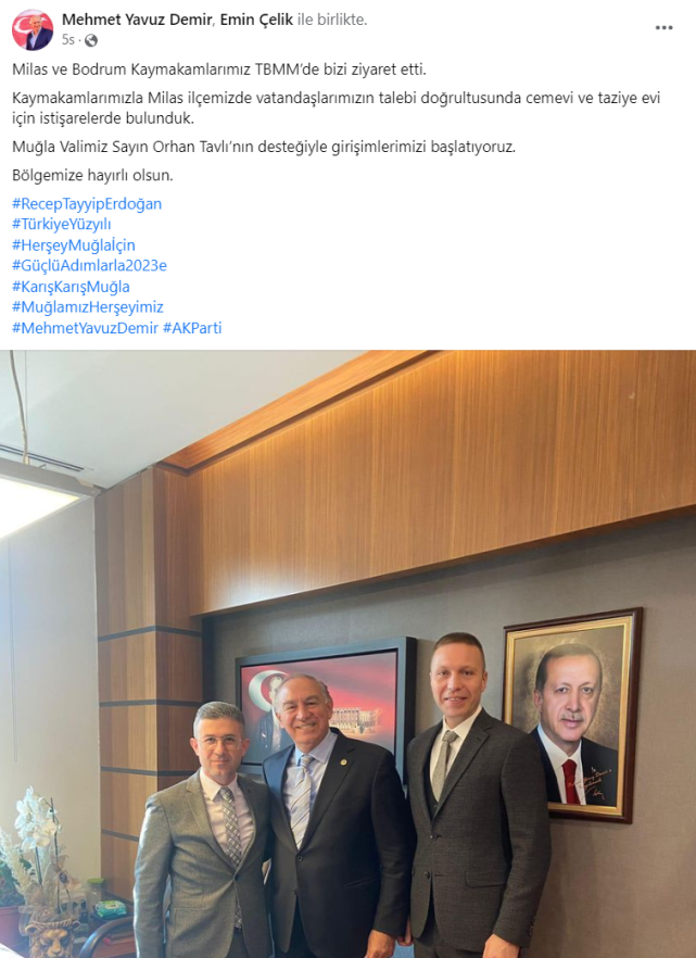 Ziyareti sosyal medya hesabından paylaşan milletvekili Demir; “Kaymakamlarımızla Milas ilçemizde vatandaşlarımızın talebi doğrultusunda cemevi ve taziye evi için istişarelerde bulunduk.