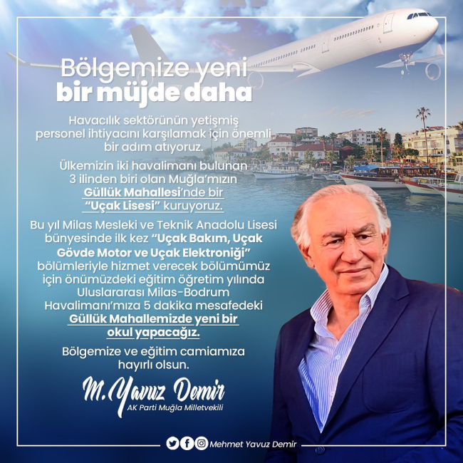 Bu yıl Milas Mesleki ve Teknik Anadolu Lisesi bünyesinde ilk ''Uçak Bakım, Uçak Gövde Motor ve Uçak Elektroniği'' açılacak bölümler için önümüzdeki eğitim öğretim yılında Güllük Mahallesinde yeni bir okul yapılacağının müjdesini verdi.