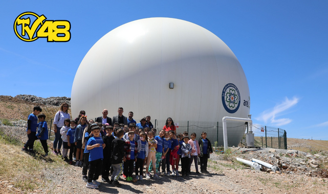 Menteşe’de şehir merkezinden görülen büyük balonu hep merak ettiklerini söyleyen çocuklar bu balonda metan gazının biriktiği ve çöpten evlerde kullandıkları elektriğin üretildiğini yerinde öğrendiler.