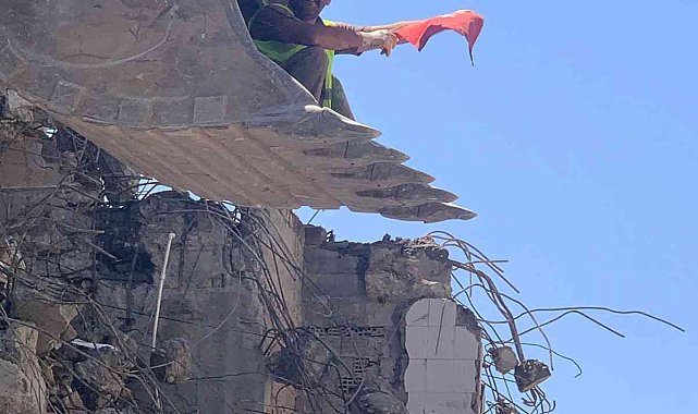 Elazığ'da deprem sonrasında ağır hasarlı binaların yıkımı devam ederken, bir işçinin fark edip kepçe yardımı ile Türk bayrağını enkaz alanından alması dikkat çekti.