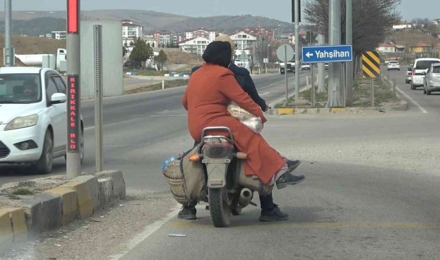 Kırıkkale'de plakasız motosiklet üzerinde kasksız yolculuk yapan iki kişi, trafikte tehlike saçtı. Ana cadde üzerinde hareket halindeyken motosiklete yan oturan kadın, bir eliyle ekmeği tutup diğer eliyle de sürücüden tutunarak kendini korumaya çalıştı. Önlem almadan motosikletle trafiğe çıkarak hem kendi canlarını hem de diğer sürücüleri tehlikeye attı.