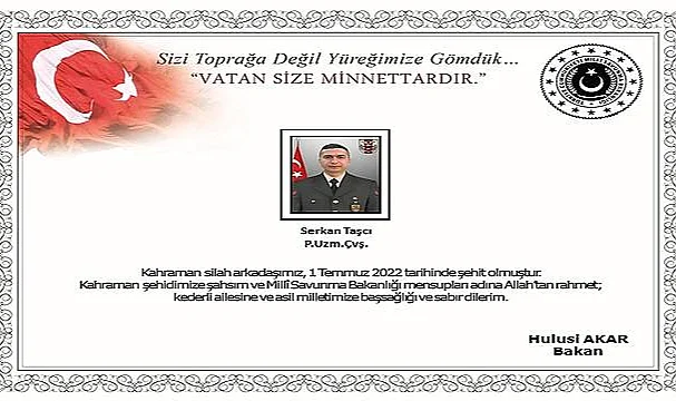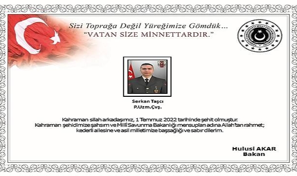 Milli Savunma Bakanlığı, Pençe-Kilit Operasyonu bölgesinde Piyade Uzman Çavuş Serkan Taşcı'nın şehit olduğunu açıkladı.