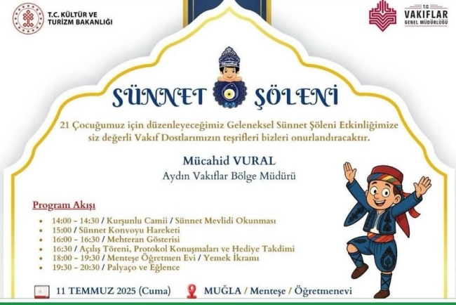 Muğla’nın Menteşe ilçesinde, T.C. Kültür ve Turizm Bakanlığı Vakıflar Genel Müdürlüğü öncülüğünde, 21 çocuk için düzenlenen Geleneksel Sünnet Şöleni büyük bir coşkuyla kutlanacak. Aydın Vakıflar Bölge Müdürlüğü tarafından organize edilen etkinlik, 11 Temmuz 2025 Cuma günü Menteşe Öğretmenevi’nde gerçekleştirilecek.