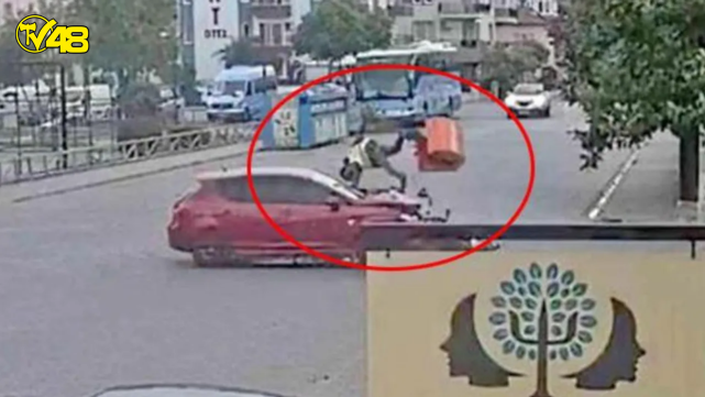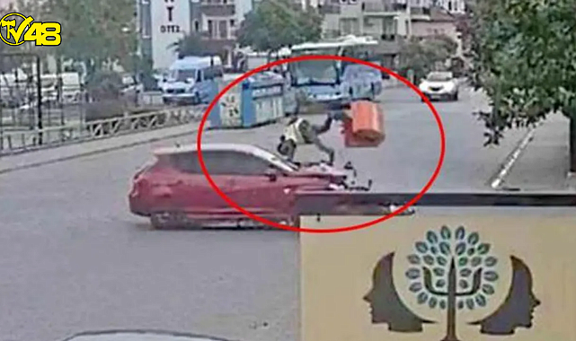 Fethiye'de bir kuryenin kullandığı motosiklet seyir halinde otomobile çarptı. Kameraya saniye saniye kaydedilen olayda kurye, çarpışmanın etkisiyle bir evin bahçesine düştü.