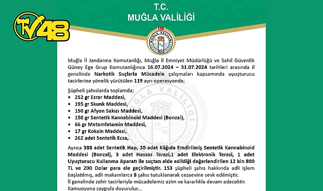Muğla İl Jandarma Komutanlığı, Muğla İl Emniyet Müdürlüğü ve Sahil Güvenlik Güney Ege Grup Komutanlığı tarafından gerçekleştirilen kapsamlı narkotik suçlarla mücadele operasyonları sonucunda, 16 Temmuz 2024 ile 31 Temmuz 2024 tarihleri arasında 119 ayrı operasyon düzenlendi. Bu operasyonlarda, uyuşturucu tacirlerine büyük bir darbe indirildi.
