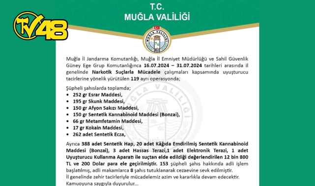 Muğla İl Jandarma Komutanlığı, Muğla İl Emniyet Müdürlüğü ve Sahil Güvenlik Güney Ege Grup Komutanlığı tarafından gerçekleştirilen kapsamlı narkotik suçlarla mücadele operasyonları sonucunda, 16 Temmuz 2024 ile 31 Temmuz 2024 tarihleri arasında 119 ayrı operasyon düzenlendi. Bu operasyonlarda, uyuşturucu tacirlerine büyük bir darbe indirildi.