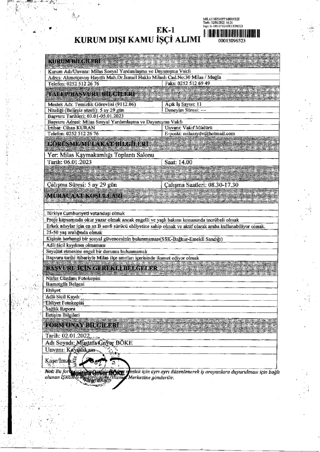 Muğla Milas Sosyal Yardımlaşma ve Dayanışma Vakfı, Temizlik Görevlisi, Geçici 11 İşçi Alacak. Son başvuru tarihi 5 Ocak 2023 olduğu açıklandı.
