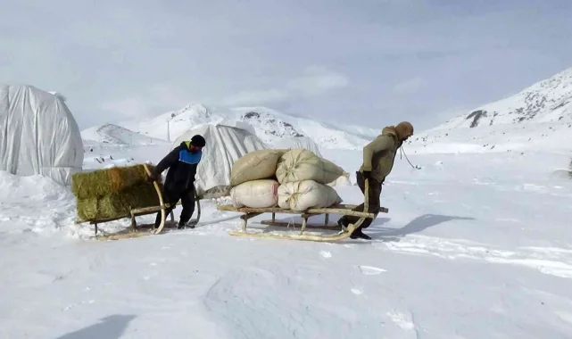Muş'un yüksek rakımlı bölgelerinde besicilik yapan vatandaşlar, çetin kış koşullarında kızaklarla taşıdıkları otlarla hayvanlarını beslemeye çalışıyor.