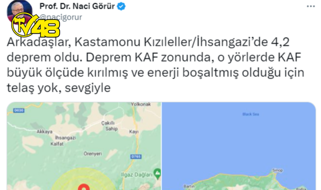 "Telaş yok" diyen Prof. Dr. Görür Twitter hesabından yaptığı paylaşımda şu ifadeleri kullandı; "Arkadaşlar, Kastamonu Kızıleller/İhsangazi'de 4,2 deprem oldu. Deprem KAF zonunda, o yörelerde KAF büyük ölçüde kırılmış ve enerji boşaltmış olduğu için telaş yok, sevgiyle."