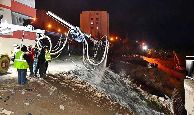 İzmir Büyükşehir Belediyesi, Narlıdere'de iki bina arasında kalan ve yağışların etkisiyle çöken istinat duvarı için alarma geçti. Bölgede çalışma yürüten büyükşehir ekipleri, beklenen yağışlar öncesi toprak kaymasının önüne geçmek ve iki binanın güvenliğini sağlamak için çökmenin yaşandığı alanda püskürtme beton çalışması yaptı.
