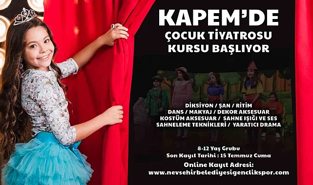 Nevşehir Belediyesi Gençlik ve Spor Müdürlüğü bünyesinde faaliyetlerini sürdüren Kapadokya Eğitim Merkezi(KAPEM)'de 8-12 yaş grubu çocuklar için Tiyatro ve Drama Kursu açılacak.