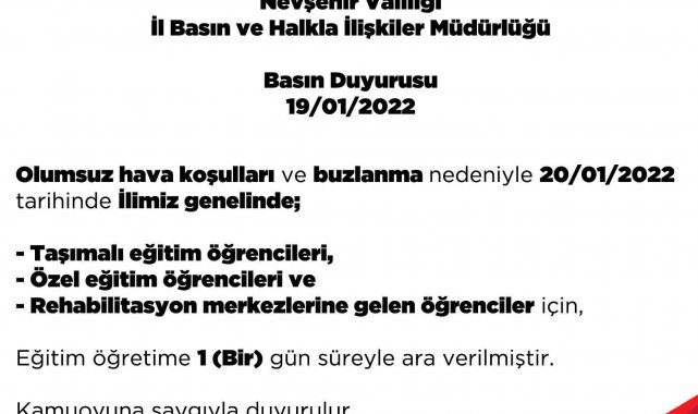 Nevşehir Valiliğinden yapılan yazılı açıklamaya göre, "Olumsuz hava koşulları ve buzlanma nedeniyle Perşembe günü il genelinde taşımalı eğitim öğrencileri, özel eğitim öğrencileri ve rehabilitasyon merkezlerine gelen öğrenciler için eğitim öğretime 1 gün süreyle ara verilmiştir" denildi