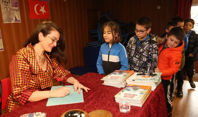 Kanbolat söyleşi sonunda Nilüfer Belediyesi tarafından armağan edilen kitaplarını çocuklar için imzaladı.