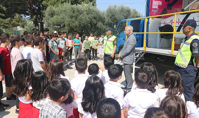 Aydın'ın Nazilli ve Kuyucak ilçelerinde emniyet kemeri kullanımının önemi öğrencilere simülasyon aracı ile anlatıldı