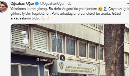 youtube kanalında, yaptığı siyasi programlarla son dönemde adından sıkça söz ettiren ünlü isimlerden youtuber Oğuzhan Uğur, gözaltına alındığını twitter hesabından yaptığı esprili bir paylaşımla duyurdu.