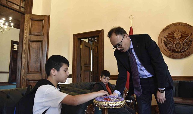 Bilecik'te Atatürk İlköğretim Okulu öğrencilerinden Bedirhan Yağmur ve Erkan Yağmur, Vali Dr. Kemal Kızılkaya'ya bayramlaşma ziyaretinde bulundu.