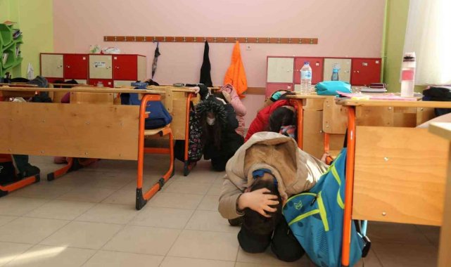 '2022 Afet Tatbikatı Yılı' kapsamında gerçekleştirilen 'Deprem Anı ve Tahliye Tatbikatında' öğrencilere deprem anında ve deprem sonrası tahliye sırasında ne yapılması gerektiğini uygulamalı olarak gösterildi.