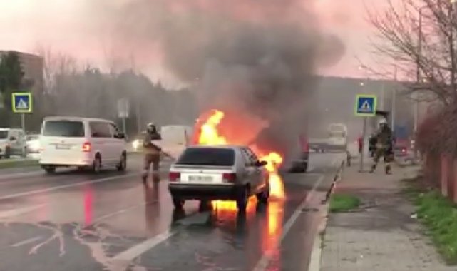Otomobil alev alev yandı, sürücü son anda kurtuldu