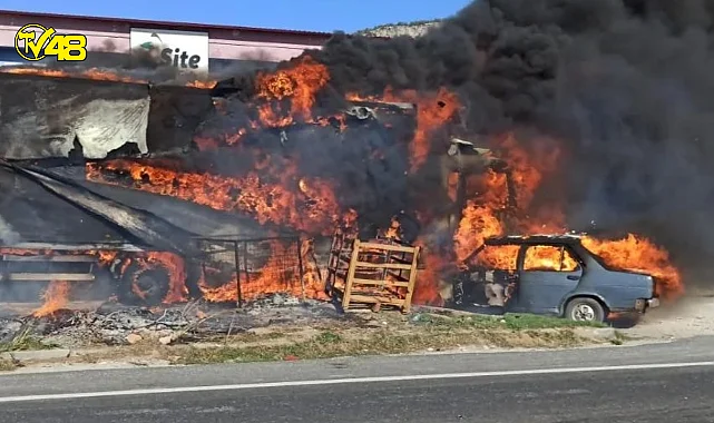 Muğla'nın Ula ilçesi Gökova mahallesindeki kavşakta park halinde bulunan otomobil ve tır çıkan yangında küle döndü.