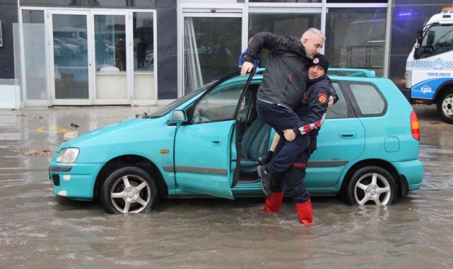 Kocaeli'de seyir halinde olan otomobilin sağ ön tekerleği, mazgal demiri olmayan çukura sıkıştı. Yükselen yağmur suları sebebiyle dışarıya çıkamayan sürücüyü ise itfaiye eri kucağına alarak otomobilden çıkardı.