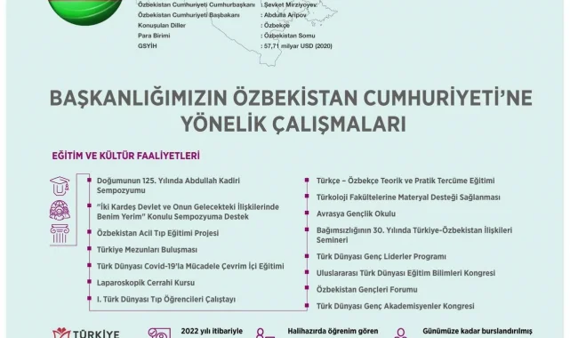 Yurtdışı Türkler ve Akraba Topluluklar Başkanlığı (YTB), Cumhurbaşkanı Recep Tayyip Erdoğan'ın çalışma ziyaretinde bulunacağı Özbekistan'da nitelikli insan kaynağının yetişmesi için eğitim ve kültürel işbirliği faaliyetleri gerçekleştirirken, Özbek tarihinde ve edebiyatında iz bırakmış önemli şahsiyetlere yönelik de anma programları düzenliyor.
