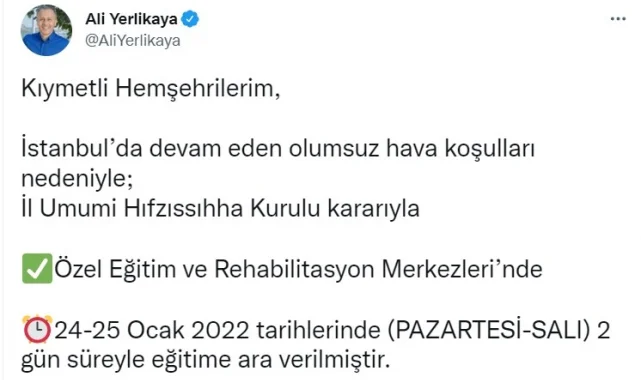 İstanbul Valisi Ali Yerlikaya sosyal medya hesabından yaptığı paylaşımda İl Umumi Hıfzıssıhha Kurulu kararınca özel eğitim ve rehabilitasyon merkezlerinde 24-25 Ocak tarihlerinde 2 gün süreyle eğitime ara verildiğini duyurdu.