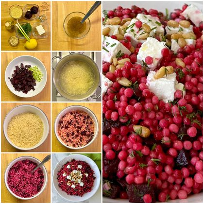 - Haşlanan kuskusu sıcakken geniş bir kaba aktarın, bekletmeden zeytinyağlı sos, doğranmış pancar ve taze sarımsağı ekleyip karıştırın. Kabı streç film ile kaplayarak tamamen soğuyana kadar buzdolabında bekletin (pancarın renginin kuskusa tamamen geçmesi için bir gece bekletiyorum).