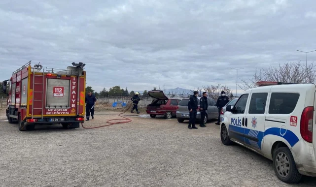 Nevşehir'de park halindeyken alev topuna dönen otomobil, kullanılamaz hale geldi.