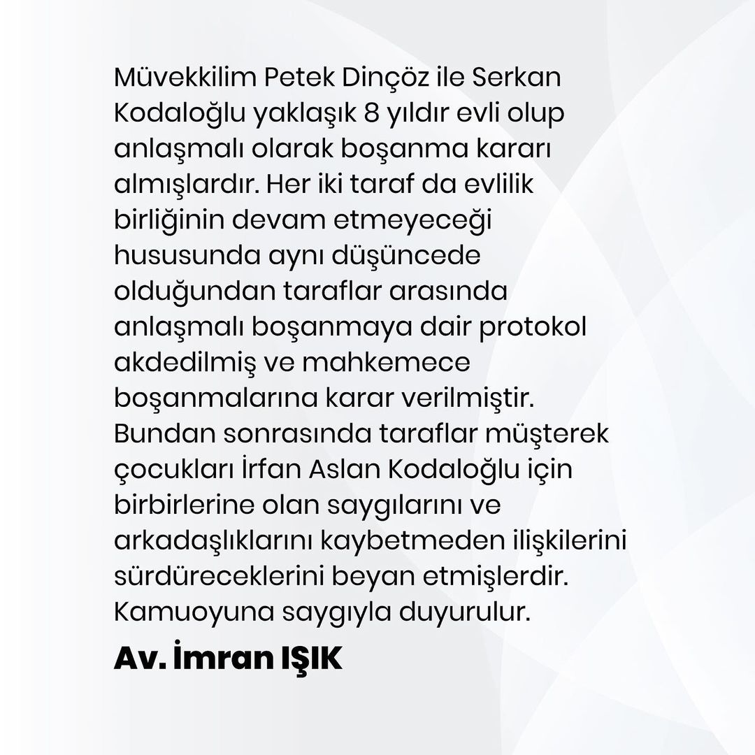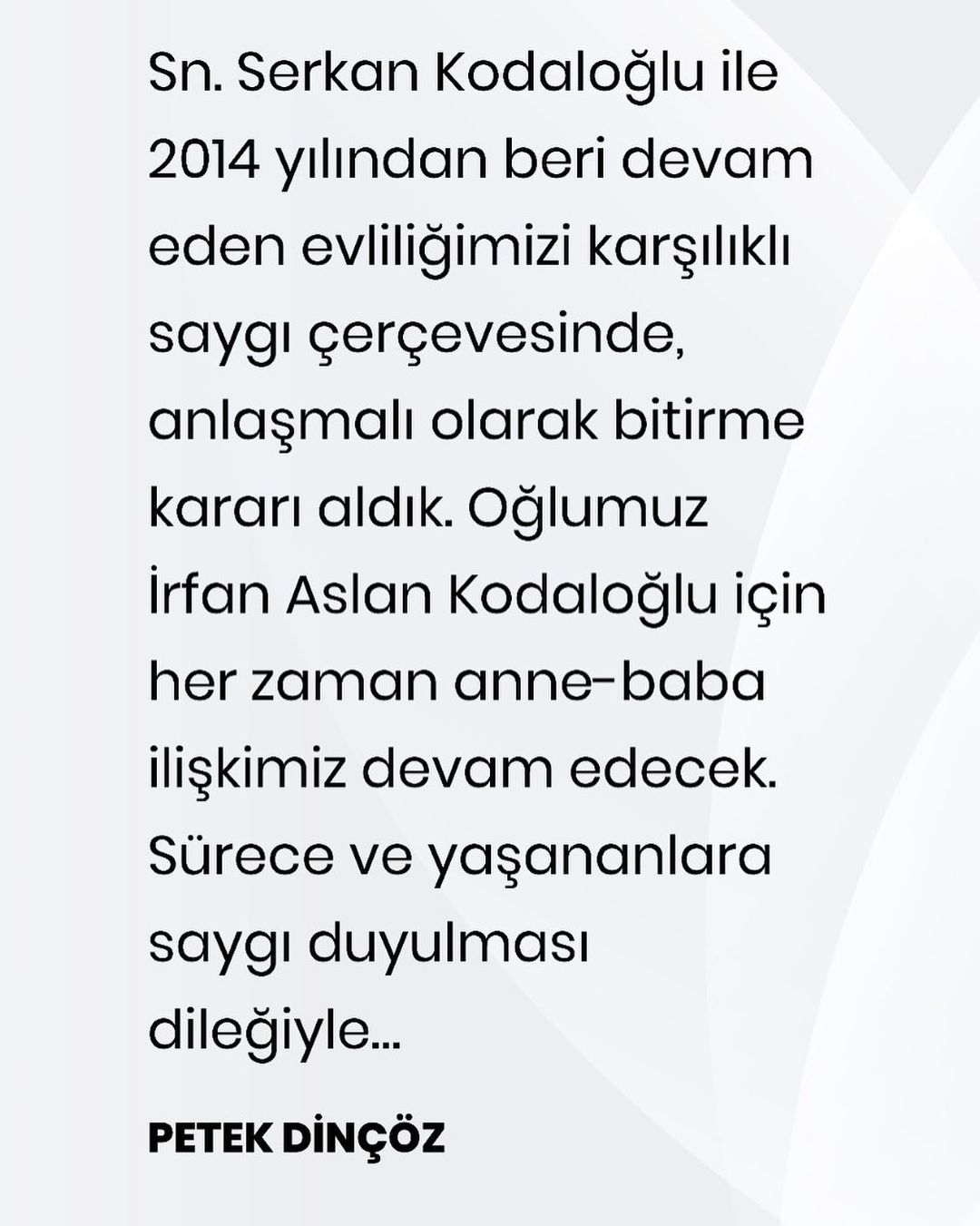 Petek Dinçöz, 2014 yılında Serkan Kodaloğlu ile nikah masasına oturmuştu. İrfan Aslan adında bir de oğulları olan çift 8 yıllık evliliklerini bugün bitirdiklerini açıkladı. Petek Dinçöz boşandıklarını sosyal medyadan duyurdu.