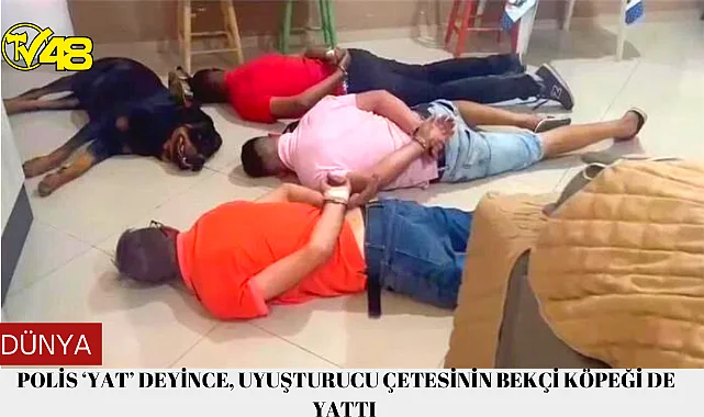 Polis, şüphelileri yere yatırarak ellerinden kelepçelerken, uyuşturucu kaçakçılarının Rottweiler cinsi bekçi köpeği de yere yattı.