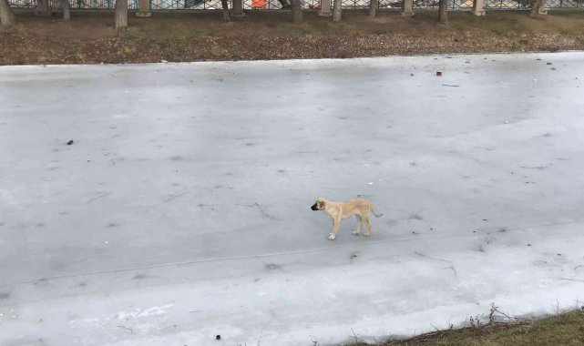 Eskişehir'de buz tutan Porsuk Çayı'nın üzerinde gezintiye çıkan sokak köpeği dikkat çekti.