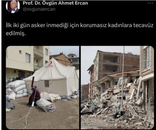 AA’nın haberine göre Malatya Başsavcılığı, Ercan hakkında, 6 Şubat’taki Kahramanmaraş merkezli depremlere yönelik sosyal medyadan yaptığı “İlk iki gün asker inmediği için korumasız kadınlara tecavüz edilmiş” şeklindeki paylaşımı gerekçesiyle soruşturma başlattı.