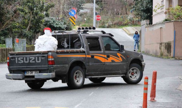 Rize'de kamyonetin kasasında bulunan kardan adamın şehir turu ilgi odağı oldu.