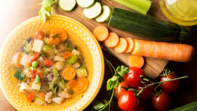 Yapılışı: Tencereye zeytinyağı alınır ve sarımsak ve soğan kavrulur. Sebzeler eşit büyüklüklerde doğranarak tencereye alınır. Mercimek eklenerek yaklaşık 5 dakika kavrulur. Su ve baharatlar eklenerek pişmeye bırakılır. Piştikten sonra blenderdan geçirilir ve servis edilir. Afiyet olsun.