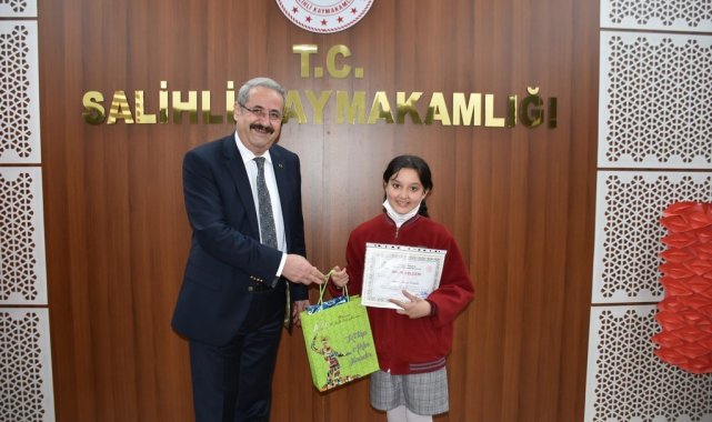 Manisa'nın Salihli ilçesindeki kütüphaneden en çok kitap alıp okuyan öğrenciler ve vatandaşlar, İlçe Kaymakamı Mehmet Kamil Sağlam tarafından ödüllendirildi.